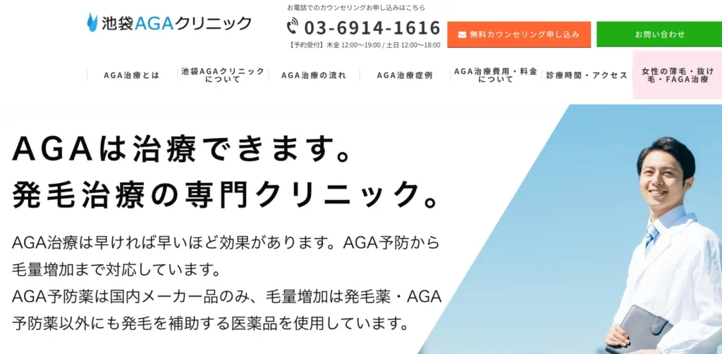 池袋駅から徒歩圏内にあるAGA・薄毛治療専門クリニックです。フィナステリドやデュタステリドなどの内服薬による治療に加え、ミノキシジルや成長因子を用いたメソセラピーなどの発毛治療を提供しており、患者の症状や進行度に合わせた治療プランを提案しています。